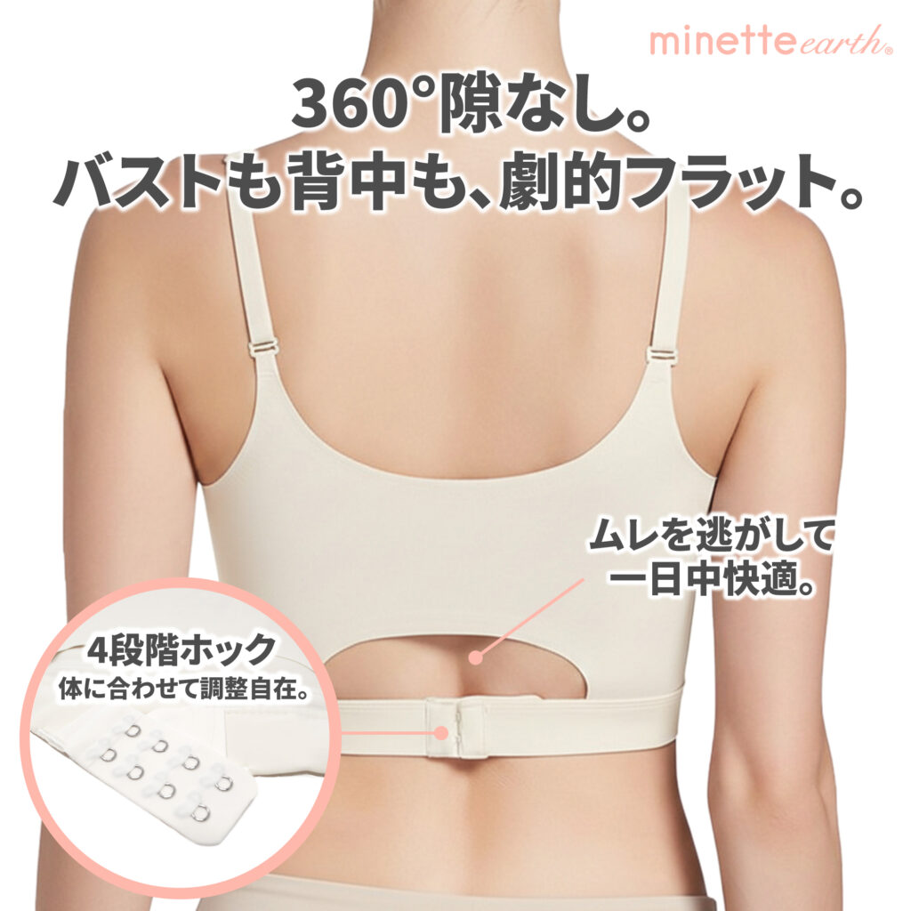 脇高設計と幅広のサイドベルトにより、気になる脇肉や背中の段差をしっかりとカバーし、360度どこから見てもスッキリとしたボディラインを整えます。 3段階の調整フック(背中側)で、その日の体調や好みの締め付け具合に自由自在にフィットさせることが可能です。パッド入りで胸ツンも気になりません。