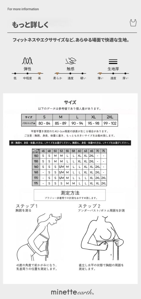 日本人スタッフが監修したサイズ表に基づき、Sから2XLまで豊富にラインナップ。 小さめのバストから大きなバストまで、一人ひとりに最適なサイズが見つかります。 万が一サイズが合わない場合も、国内ブランドならではの迅速な対応をお約束します。