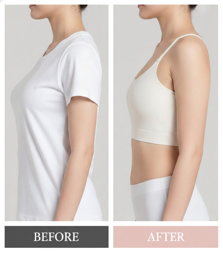 独自の高弾力アンダーベルトがバストをしっかりと抑え、一瞬で平らなラインを作ります。 表面は凹凸の少ないフラット設計なので、Tシャツやタイトな服、和装、コスプレ衣装の下でもシルエットが響かず、理想の着痩せを叶えます。